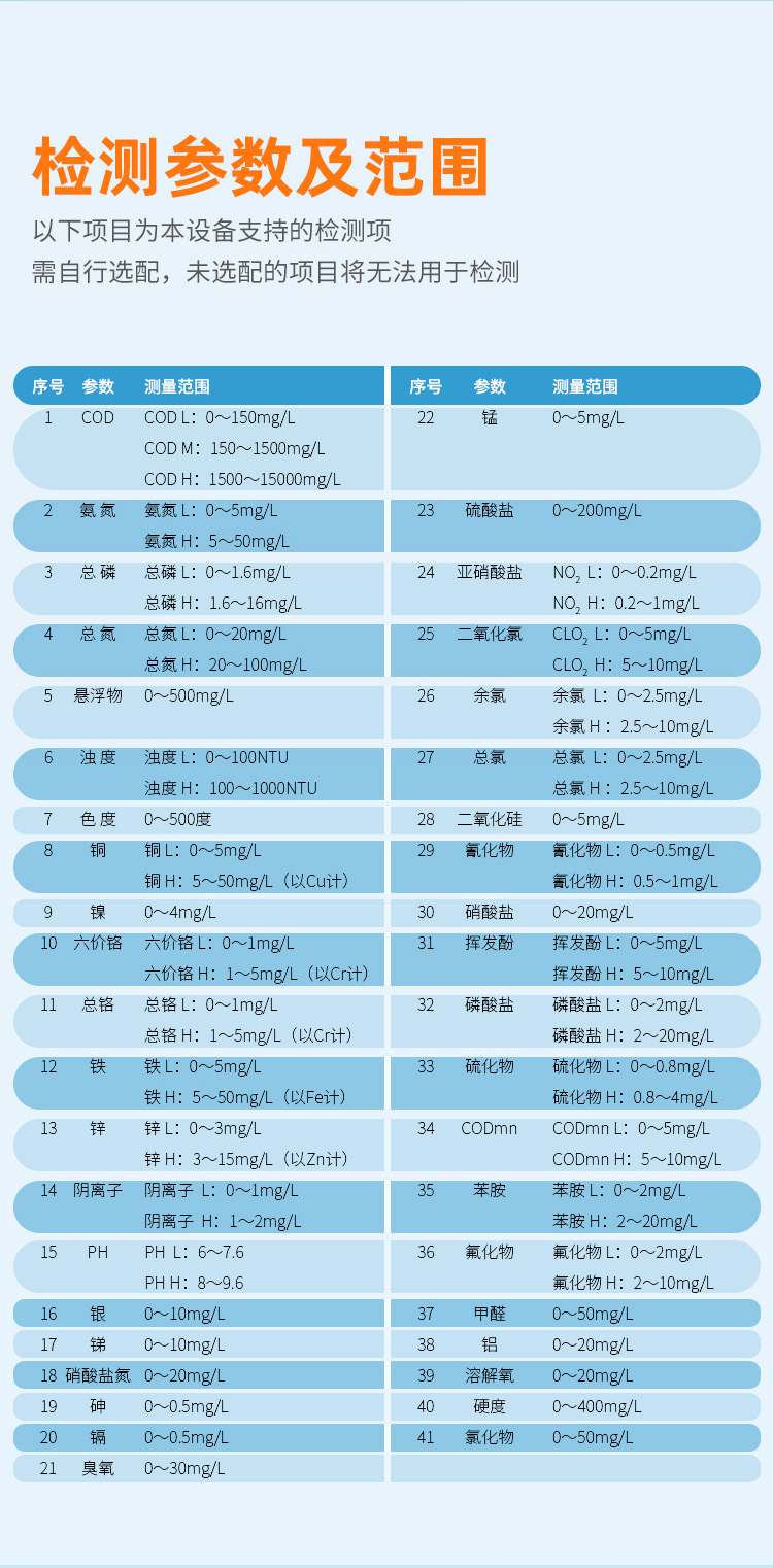 | 測定范圍 | 0-10000mg/ L(分段) | 0-50mg/L (分段) | 0-20mg/L (分段) | 0-100mg/L (分段) | 0-1000mg/L (分段) |